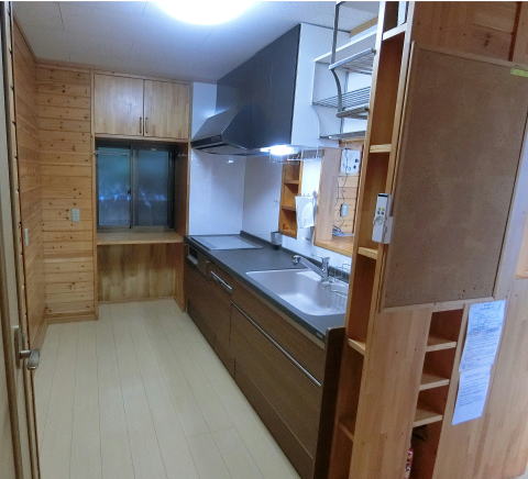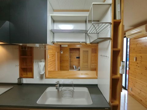 水切棚3段、まな板ラック、サランラップホルダー、A4より大きい料理本も入る気配り本棚、タオル掛、フキン掛等々いたれり尽くせりの気配キッチン!